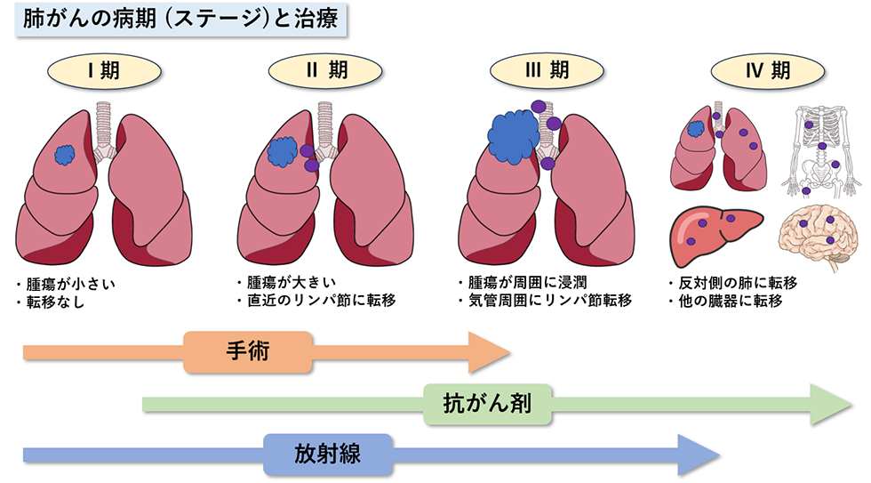 正確な診断のために気管支鏡検査等で肺の細胞の採取を行い、CT、MRI、FDG-PETなどの画像検査で転移の有無を評価します。その上で全身状態・臓器機能・生活背景などを総合的に判断し、患者さんごとに最適な治療法を提案いたします。
